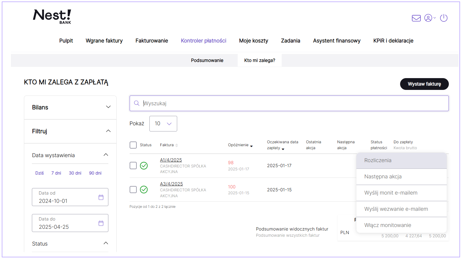 W celu wysłania monitu lub wezwania należy przejść do zakładki Kontroler płatności / Kto mi zalega? i wybrać opcję wyślij monit e-mailem lub wyślij wezwanie e-mailem.