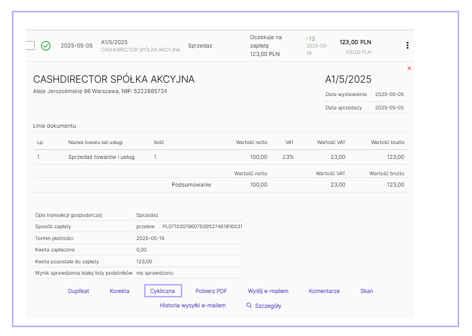 - Dla jednego dokumentu pierwotnego można wystawić tylko jedną fakturę cykliczną;