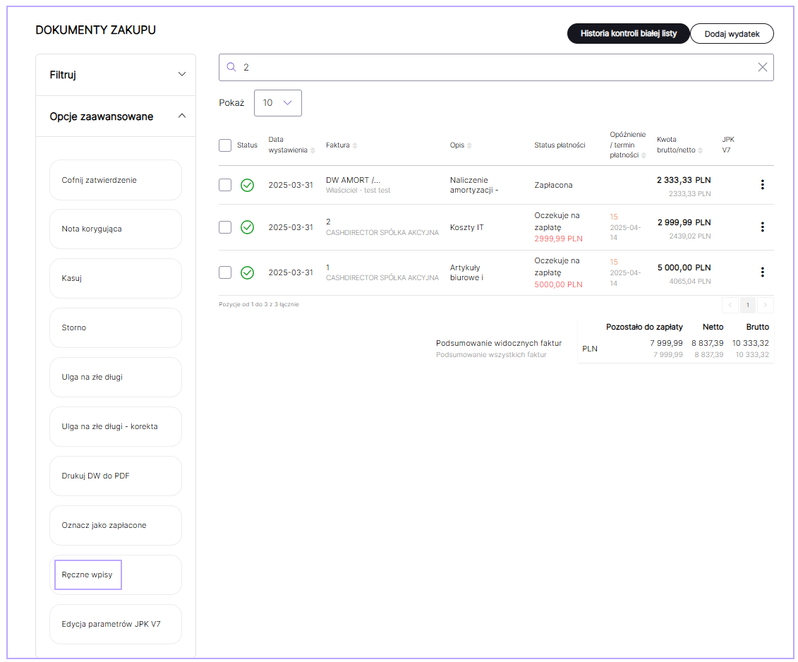 W systemie Obsługa faktur istnieje możliwość zaksięgowania dokumentów ręcznymi wpisami w celu wskazania zapisu w odpowiedniej pozycji KPIR, jak i Rejestru VAT. Aby dodać ręczny wpis należy: