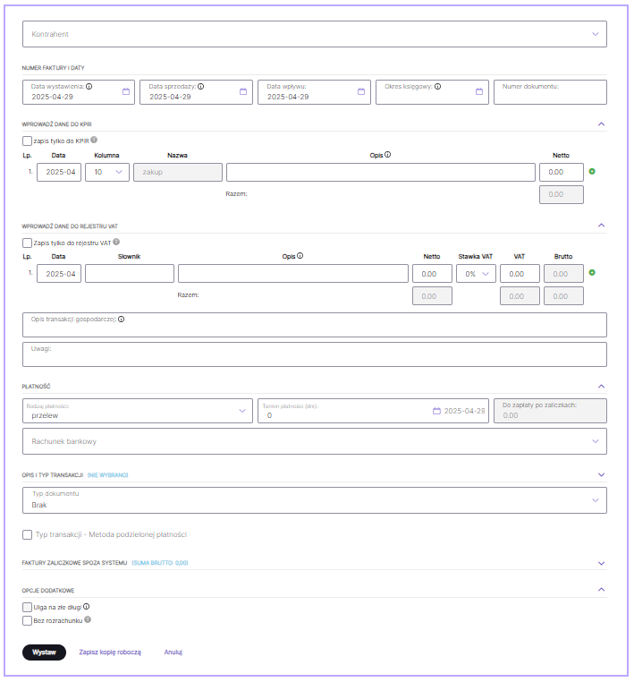- KPIR, poprzez zaznaczenie checboxem parametru Zapis tylko do KPIR lub