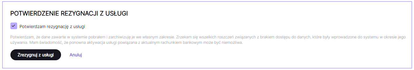 Użytkownik w każdym momencie ma możliwość zrezygnowania z usług Obsługi faktur. Przed dezaktywacją konta należy pamiętać o zarchiwizowaniu dokumentów oraz dezaktywacji aktywnych płatnych pakietów, w tym usługi księgowej.