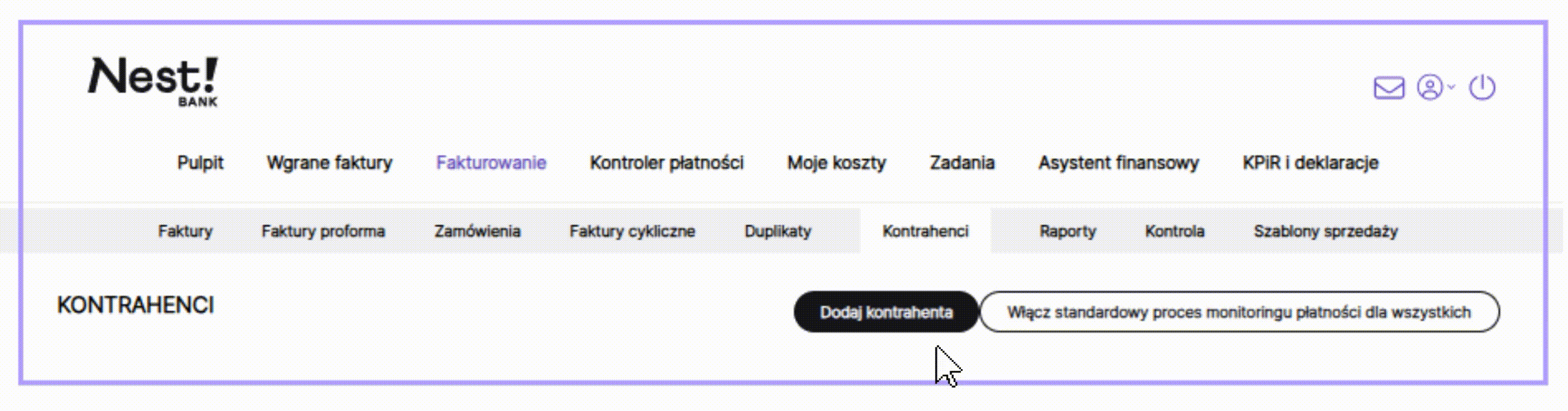 System oferuje pobieranie danych polskich kontrahentów z bazy GUS na podstawie NIP, bez konieczności ich ręcznego wprowadzania. Należy przejść w zakładki Fakturowanie/Kontrahenci i kliknąć przycisk Dodaj kontrahenta.