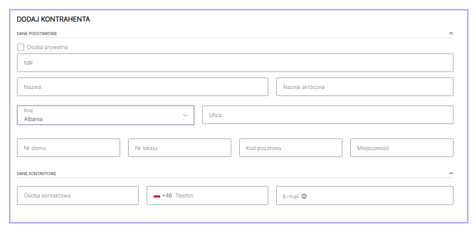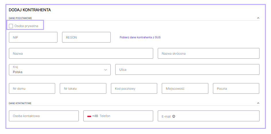 Informacje mogą być również wprowadzone ręcznie. Dotyczy to zwłaszcza przypadków, gdy wprowadzane dane dotyczą osoby fizycznej nieposiadającej NIP. Wówczas przed zapisaniem zmian należy zaznaczyć pole Osoba prywatna.