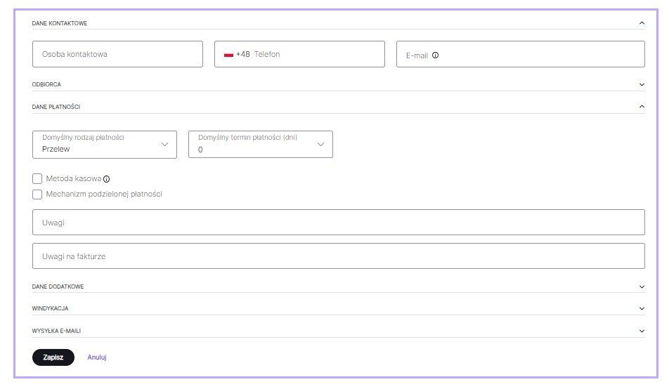- Rodzaj płatności i Termin płatności - będą automatycznie sugerowane dla każdej wystawianej faktury dla danego kontrahenta;