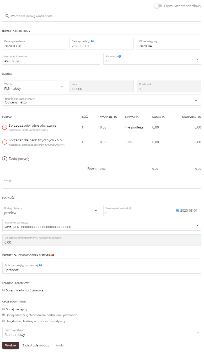 Sprzedaż (dostawca) - powinno się skorzystać z formatki Faktura sprzed. - odwrotne obciążenie, na fakturze w uwagach jest możliwość dodania tekstu Odwrotne obciążenie (taka adnotacja nie jest wymagana przepisami). Powinno się stosować stawkę NP (w niektórych systemach pojawia się zapis 'oo', co nie jest obowiązkowe). Zapis księgowany jest do 31 pozycji deklaracji VAT.