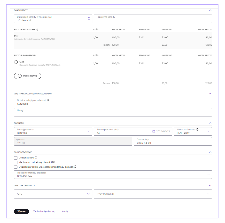 W przypadku chęci wystawienia korekty na 0 zł, podczas generowania korekty kwota w polu Przed korektą oraz Po korekcie powinny pozostać takie same.