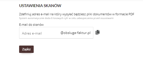 W tej zakładce definiujemy adres naszej wirtualnej poczty, aby bezpośrednio z maila przekazywać faktury do programu bez potrzeby logowania się do systemu. Po kliknięciu przycisku Zapisz system losowo dodaje 6 cyfr do wpisanego adresu e-mail ze względów bezpieczeństwa oraz aby adres e- mail był unikalny.