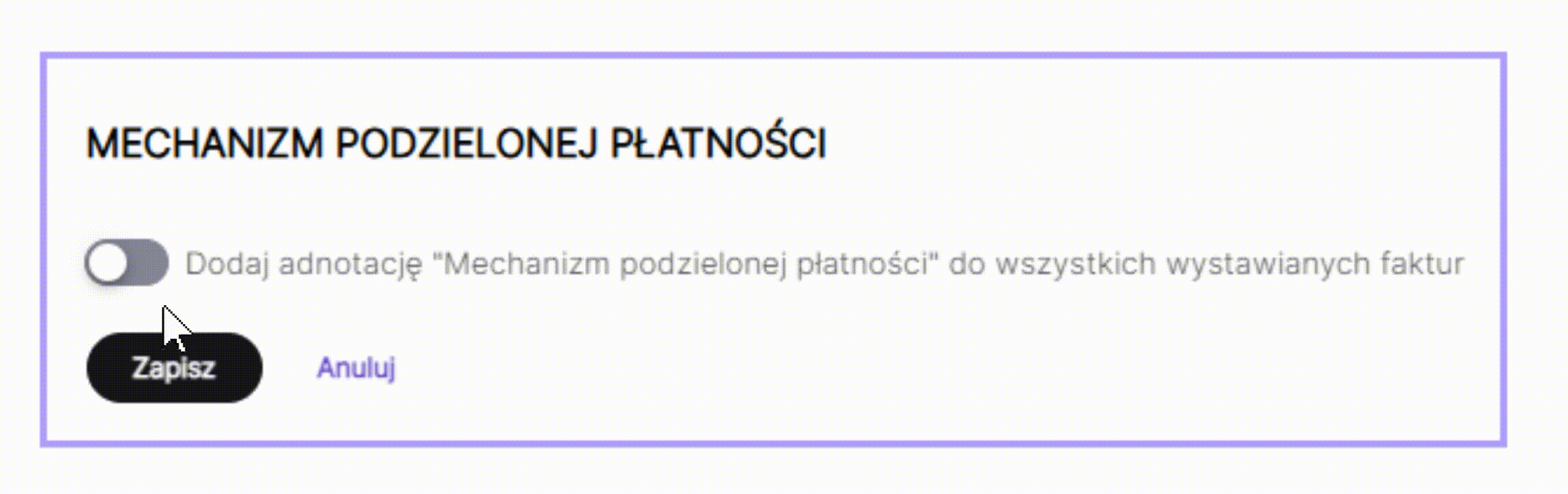 Następnie zaznaczyć parametr Dodaj adnotację Mechanizm podzielonej płatności do wszystkich wystawianych faktur i wybrać przycisk Zapisz.