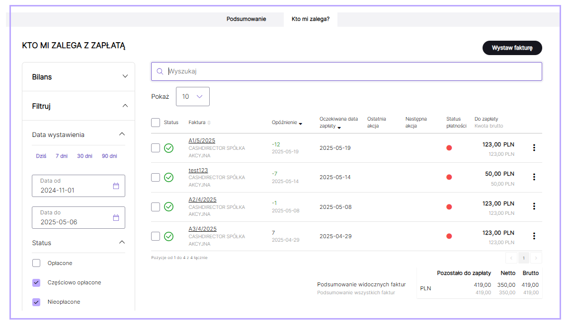 Zestawienie prezentuje listę wszystkich należności dla kontrahentów dla których termin zapłaty jeszcze nie minął oraz faktury przeterminowane w podziale na okresy.