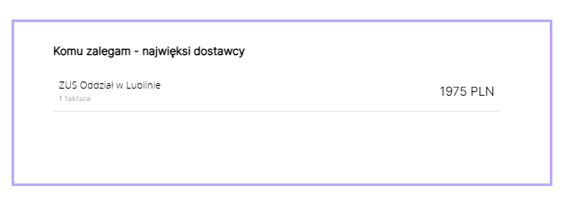 W tej liście wyświetlani są kontrahenci wobec których zalegamy z płatnościami. Po kliknięciu na wybraną pozycję zostajemy przekierowani do faktur kosztowych z automatycznie wybranymi pozycjami.