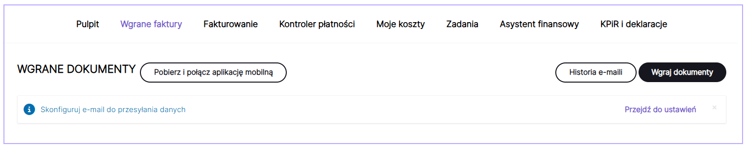 2. W zakładce Wgrane faktury wybrać przycisk Przejdź do ustawień obok Skonfiguruj e-mail do przesyłania danych.