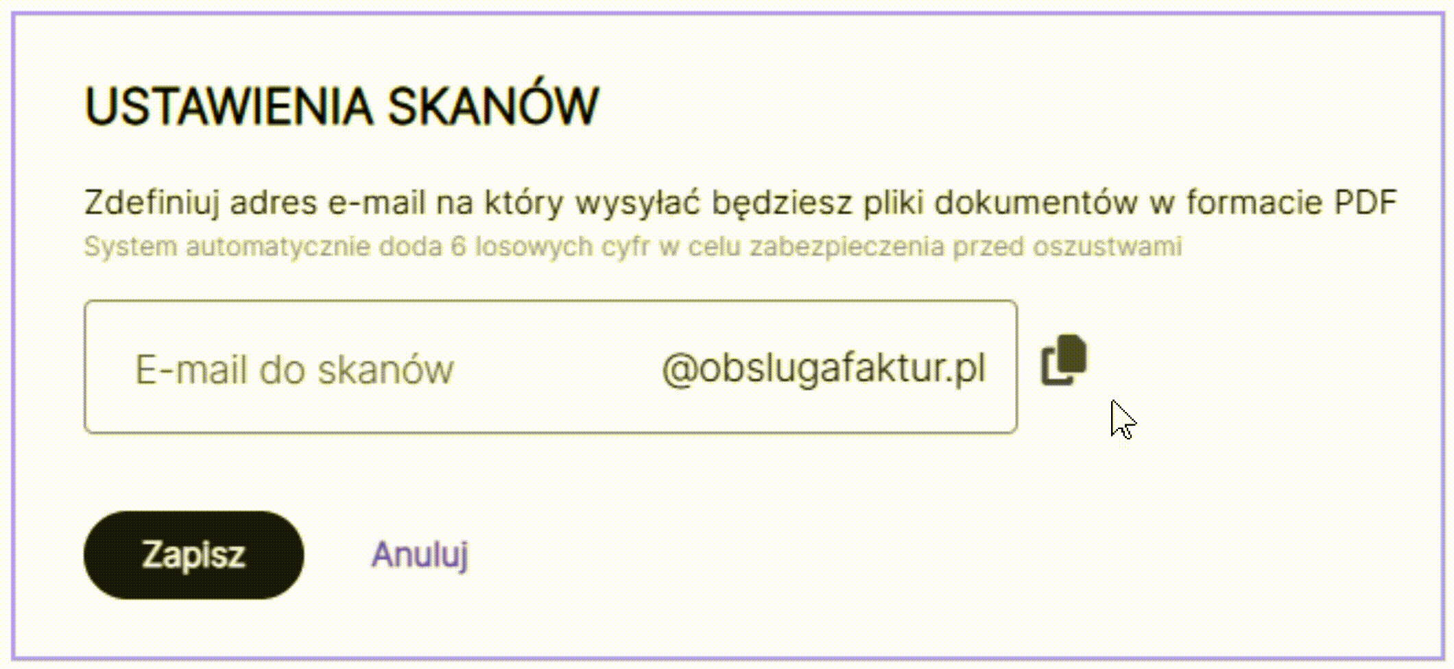W polu E-mail do skanów wpisać dowolny fragment tekstu. Po kliknięciu przycisku Zapisz, system doda do utworzonego tekstu ciąg znaków, aby adres był unikalny. W celu jego skopiowania należy wybrać szarą ikonę dokumentów znajdującą się z prawej strony wpisanego tekstu.