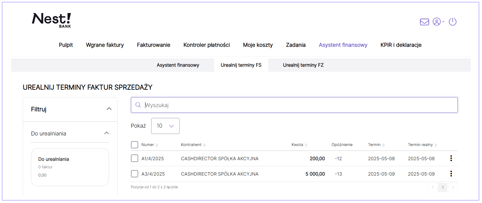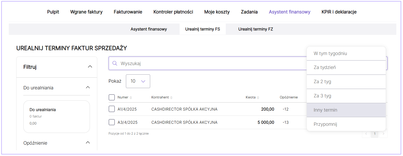 W zakładce Asystent finansowy/Urealnij terminy Faktur Sprzedaży istnieje możliwość zmiany daty nieopłaconej faktury, jeśli klient nie będzie miał możliwości sfinalizowania płatności w wyznaczonym czasie. Urealniając termin zapłaty, kwota zostanie przesunięta zgodnie z zakresem tygodnia w zakładce Asystent finansowy, więc wynik finansowy będzie bieżący.
