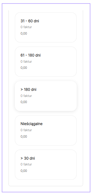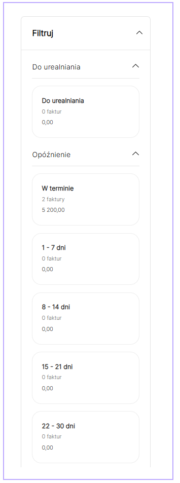 Filtry umożliwiają ustawienie widoczności faktur - z różnym terminem opóźnienia, nawet do połowy roku, a także te, które zaznaczone są jako nieściągalne.