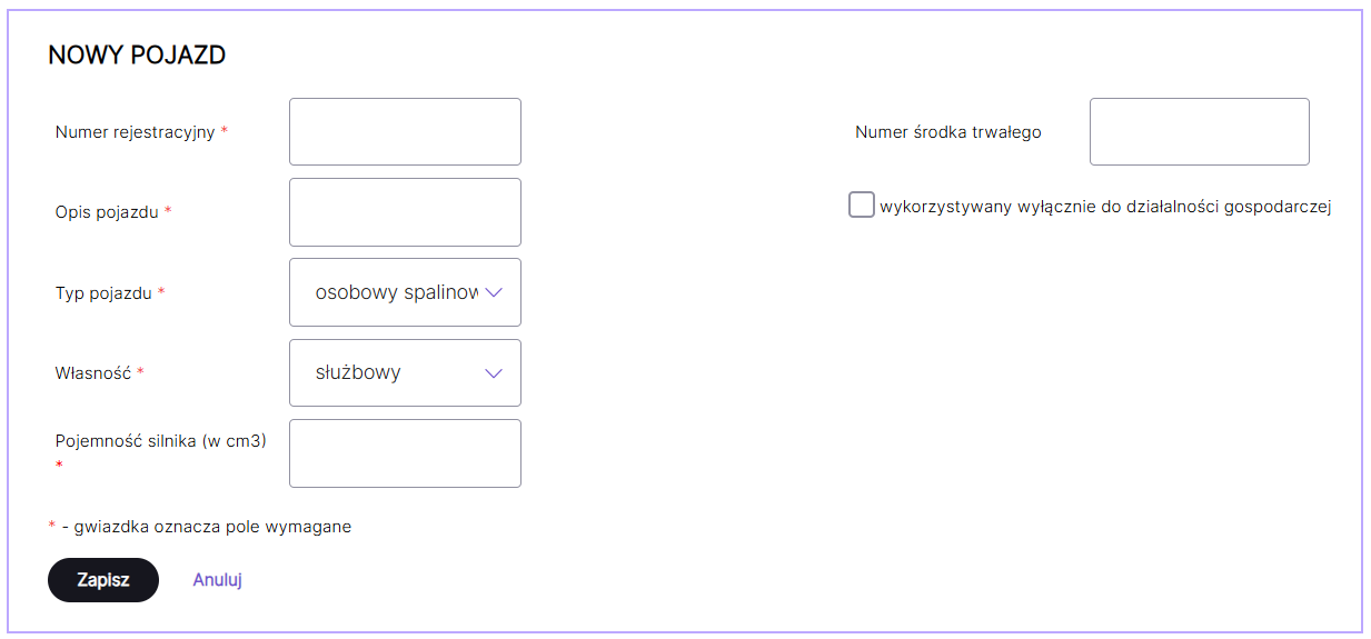 W celu wprowadzenia pojazdu należy uzupełnić poszczególne pozycje.