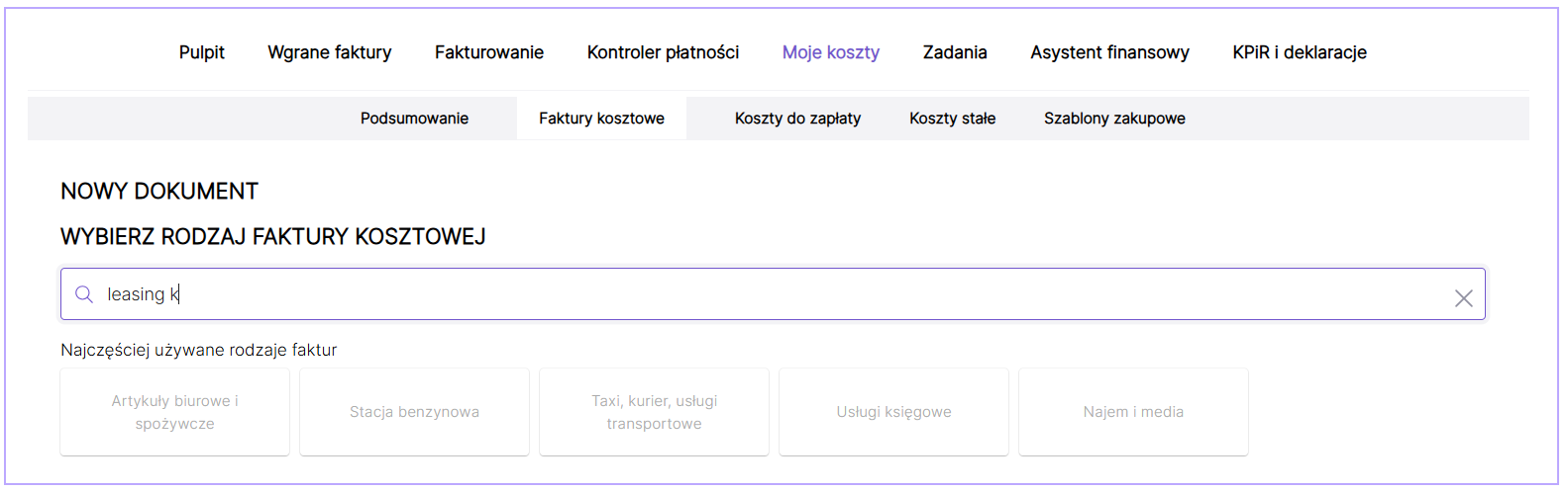 W przypadku, gdy dodajemy wydatek korzystając z szablonu Środki trwałe oraz leasing kapitałowy, w zakładce Moje koszty / Faktury kosztowe utworzy się wpis do ewidencji. Należy w nim wybrać stopę amortyzacji 100% - wpis do KPiR pojawi się po zakończonym procesie kontroli miesiąca.
