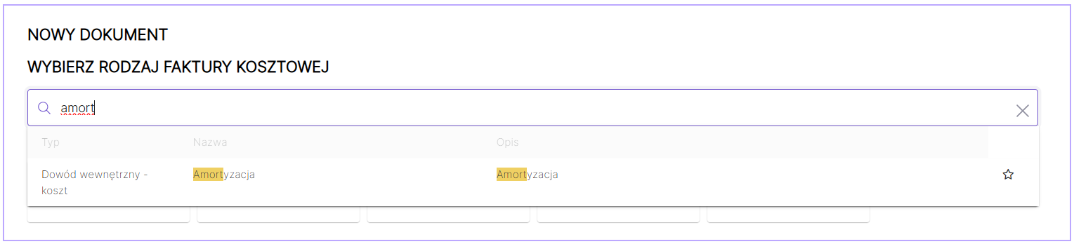 W przypadku, gdy nie wprowadzamy wydatku, a jedynie wpis do ewidencji środków trwałych, należy wybrać stopę amortyzacji 100% oraz w zakładce Moje koszty / Faktury kosztowe wprowadzić wpis do KPiR korzystając z szablonu Amortyzacja.