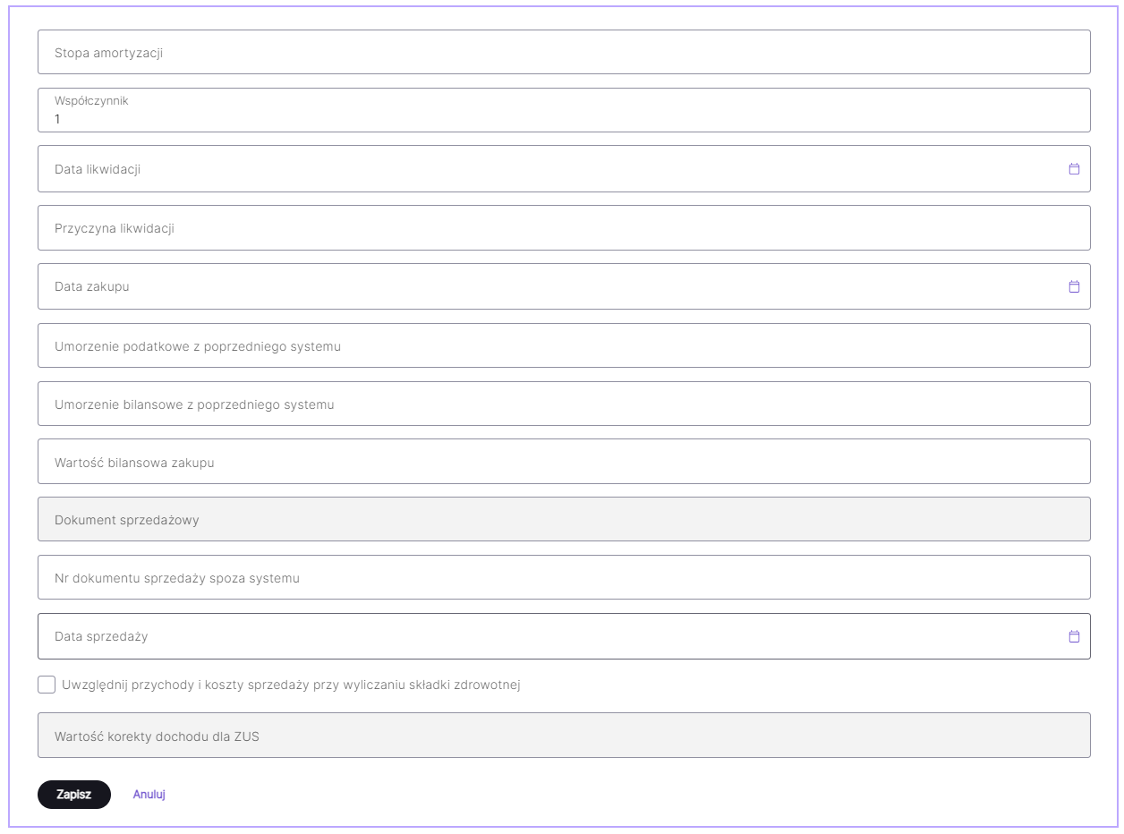 UWAGA: W przypadku, gdy do środków trwałych zostanie wprowadzony samochód osobowy o wartości przewyższającej limit do amortyzacji czyli powyżej 150 000 zł (samochód spalinowy lub hybrydowy) lub 225 000 zł (samochód elektryczny), to w celu prawidłowego generowania dowodów amortyzacyjnych należy w polu Wartość bilansowa zakupu wprowadzić wartość limitu.