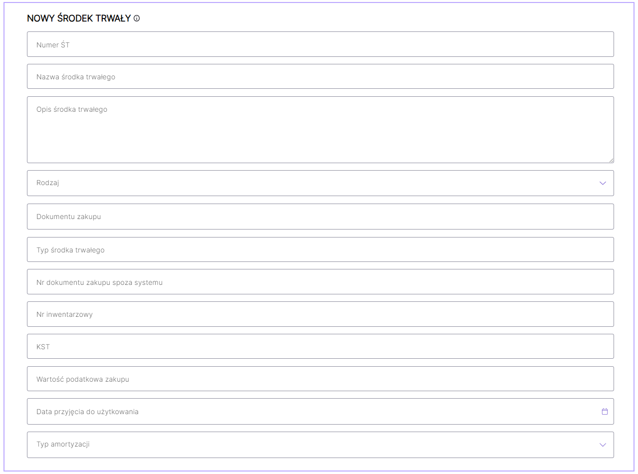 - KST- symbol Klasyfikacji Środków Trwałych, pole jest automatycznie wypełnione po wybraniu typu środka trwałego