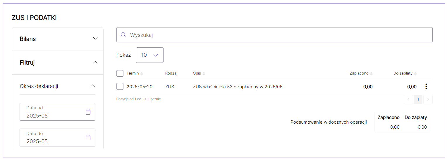 Dowód wewnętrzny ZUS właściciela 53 tworzony jest automatycznie na podstawie wprowadzonej płatności do dokumentu ZUS. W zakładce KPiR i deklaracje / ZUS i podatki dokument ZUS właściciela 53 przyjmie wartość 0.00 zł. Nie należy dodawać płatności do tego dokumentu.