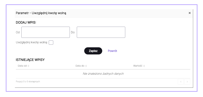Następnie należy wprowadzić zakres dat - Data od to pierwszy dzień miesiąca, w którym chcemy uwzględnić kwotę wolną w wyliczeniu zaliczki, Data do - data do kiedy chcemy, aby kwota ta była od zaliczki odejmowana lub dość odległą datę w przyszłości (np. 2030-12-31) - parametr ten może zostać zmieniony w dowolnym momencie.