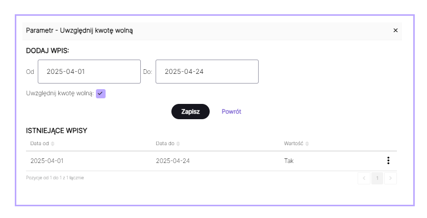Po kliknięciu Zapisz parametr zostanie dodany i wyświetli się poniżej w sekcji Istniejące wpisy.