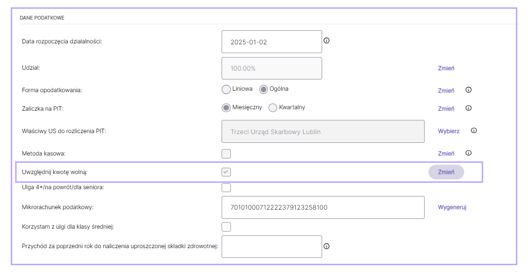 W celu weryfikacji należy przejść do zakładki Ustawienia/Właściciel. Przy parametrze Uwzględnij kwotę wolną należy kliknąć przycisk Zmień.