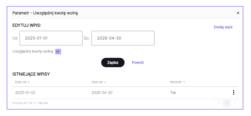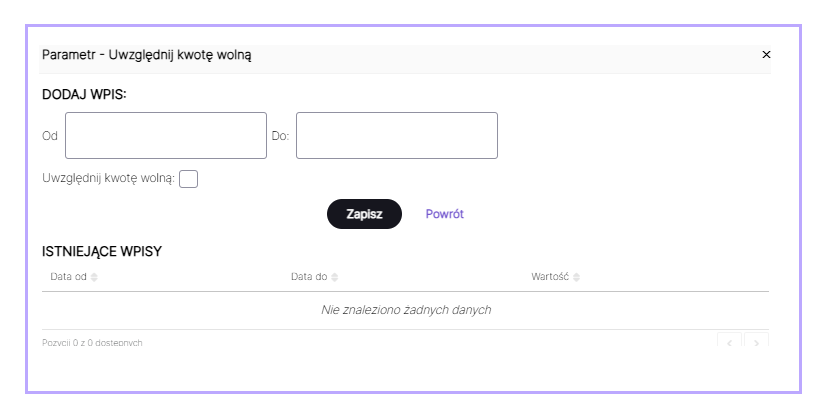 Data od to pierwszy dzień miesiąca, w którym chcemy uwzględnić kwotę wolną w wyliczeniu zaliczki, z kolei Data do oznacza datę do kiedy chcemy, aby kwota wolna była odejmowana od zaliczki lub dość odległą datę w przyszłości (np. 2026-12-31). Parametr ten można zmienić w dowolnym momencie. Po kliknięciu w Zapisz parametr zostanie podany i wyświetli się poniżej w sekcji Istniejące wpisy.