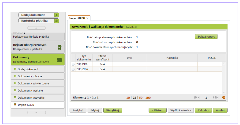 - W zakładce ePłatnik z lewej strony ekranu znajduje się folder Dokumenty. Po rozwinięciu należy wybrać Import KEDU, następnie na dwóch kolejnych ekranach dalej;