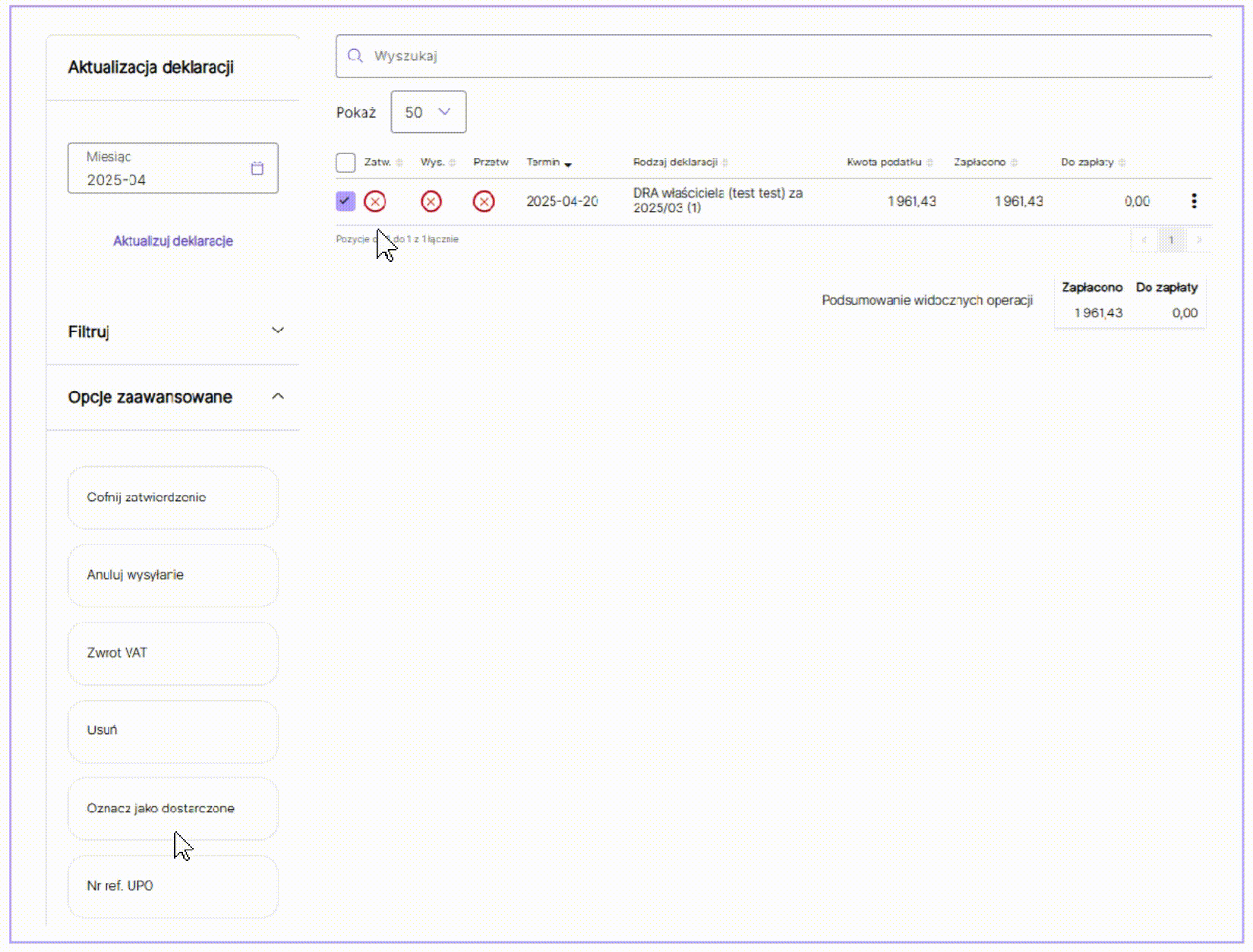 Po złożeniu deklaracji DRA ZUS w urzędzie istnieje możliwość oznaczenia dokumentu jako dostarczonego w systemie. Aby to zrobić, należy znaleźć deklarację w zakładce KPiR i deklaracje/Deklaracje, zaznaczyć ją checkboxem,