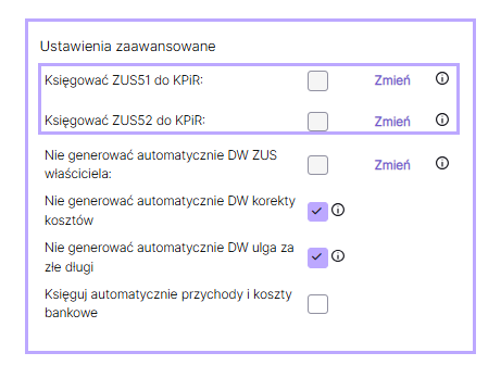 W celu zaksięgowania zapłaconych składek zdrowotnych do PKPIR należy w zakładce Ustawienia/Firma zaznaczyć parametr Księgować ZUS52 do KPiR.