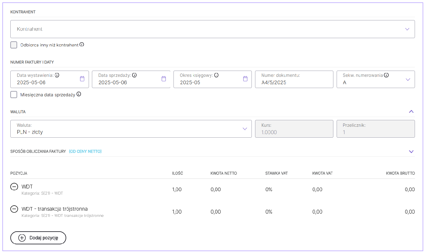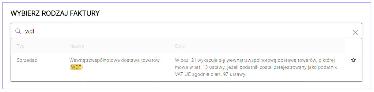 W celu wprowadzenia faktury dotyczącej Wewnątrzwspólnotowej dostawy towarów, należy przejść do zakładki Fakturowanie/Faktury. Następnie po prawej stronie u góry ekranu proszę wybrać Wystaw z szablonu i na liście dostępnych szablonów odnaleźć szablon Wewnątrzwspólnotowa dostawa towarów (WDT).