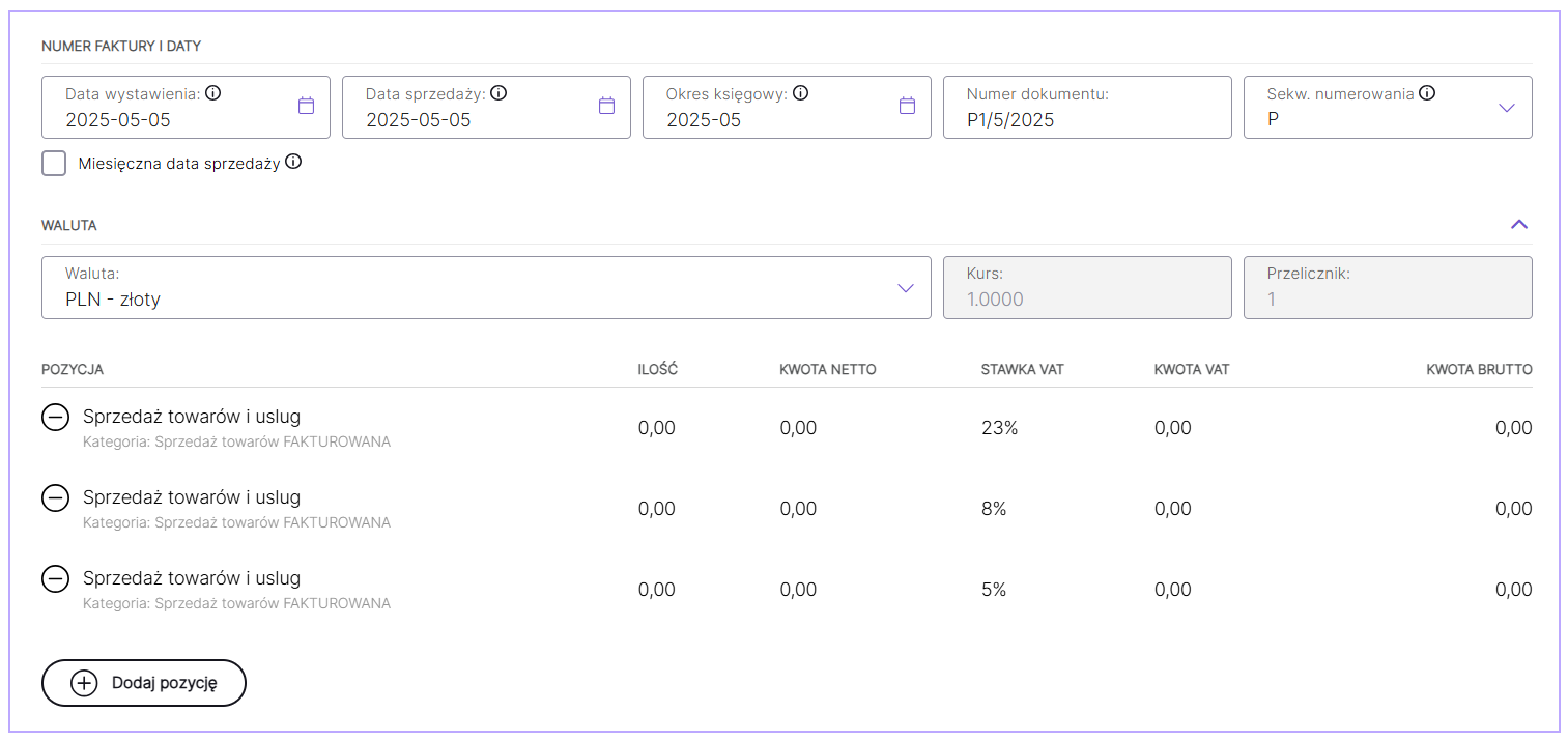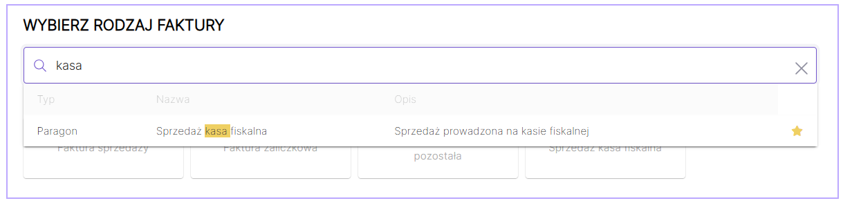 Wprowadzenie sprzedaży zarejestrowanej na kasie fiskalnej możliwe jest przy użyciu szablonu Sprzedaż kasa fiskalna. Szablon dostępny jest w zakładce Fakturowanie/Faktury po wybraniu przycisku Wystaw fakturę.