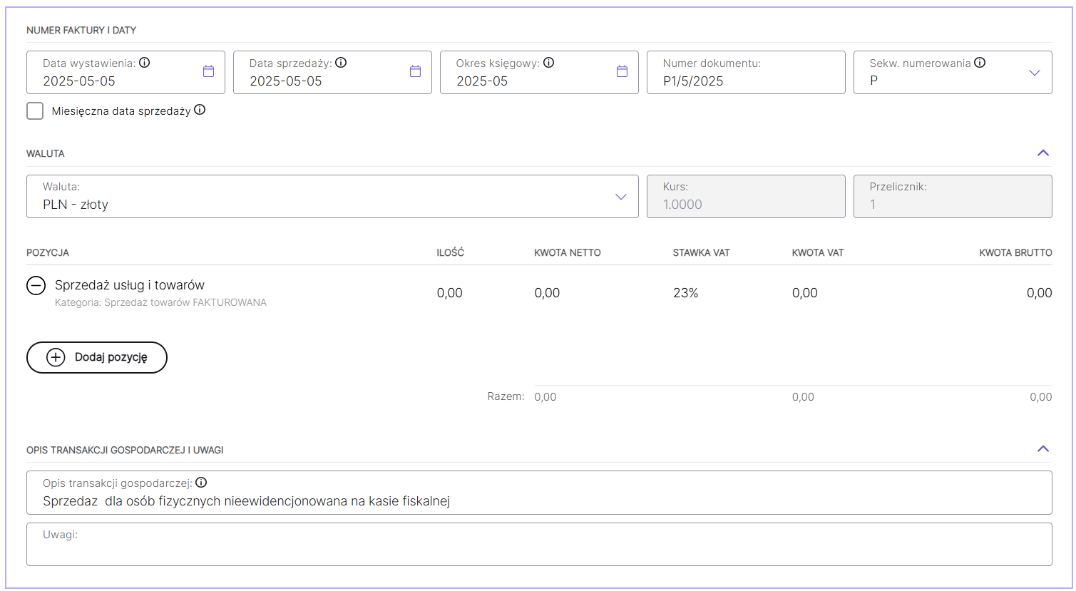 W przypadku wystąpienia sprzedaży, która nie została zarejestrowana na fakturze oraz kasie fiskalnej, istnieje możliwość zaksięgowania takiego przychodu szablonem Sprzedaż dla osób fizycznych nieewidencjonowana na kasie fiskalnej - ryczalt. Szablon dostępny jest w zakładce Fakturowanie/Faktury po wybraniu przycisku Wystaw z szablonu.