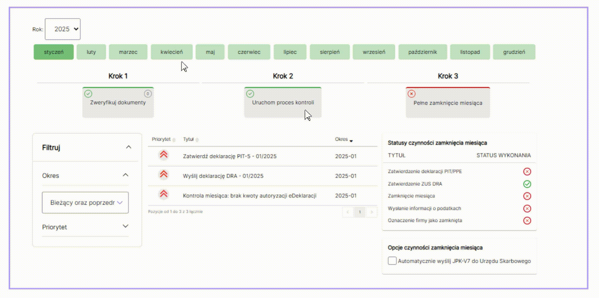 Aby wygenerować deklarację ZUS należy uruchomić proces kontroli na miesiąc kwiecień 2023 w zakładce KPiR i deklaracje/Zamknij miesiąc