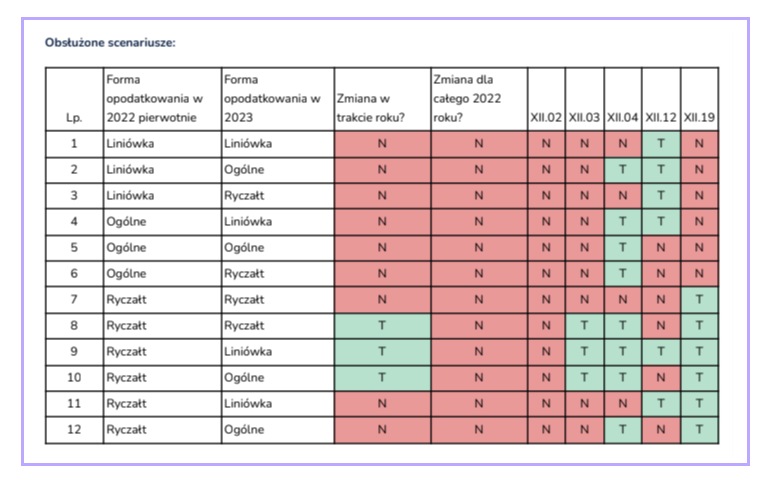 W momencie kiedy pierwsze półrocze było rozliczane na zasadach ryczałtu a następnie zmiana od lipca 2022 roku na skalę podatkową to w takim przypadku będą widoczne 2 rozliczenia dotyczące: pierwsze półrocze ryczałt (sekcja XII pola 19-25) a drugie półrocze skala (sekcja XII pola 04-11) oraz pole XII.03