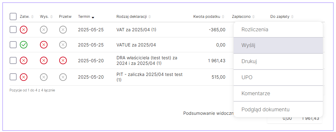 System umożliwia bezpośrednią wysyłkę deklaracji VAT UE do Urzędu Skarbowego za pomocą kwoty autoryzującej. Po dokonaniu właściwych ustawień wg instrukcji Kwota do autoryzacji eDeklaracji należy przejść do zakładki Deklaracje, zatwierdzić deklarację zmieniając jej status w kolumnie po lewej na zielony checkbox a następnie ponownie skierować kursor na zatwierdzony dokument i wybrać opcję Wyślij: