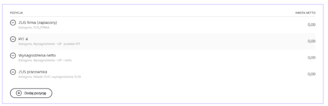 System księgowy dedykowany jest Użytkownikom prowadzącym jednoosobową działalność gospodarczą, w związku z tym nie ma możliwości wprowadzenia pracownika do systemu. Istnieje jednak możliwość księgowania jego wynagrodzenia do kosztu. W tym celu należy przejść do zakładki faktur kosztowych i skorzystać z szablonu DW Wynagrodzenia i wybrać właściwą pozycję: