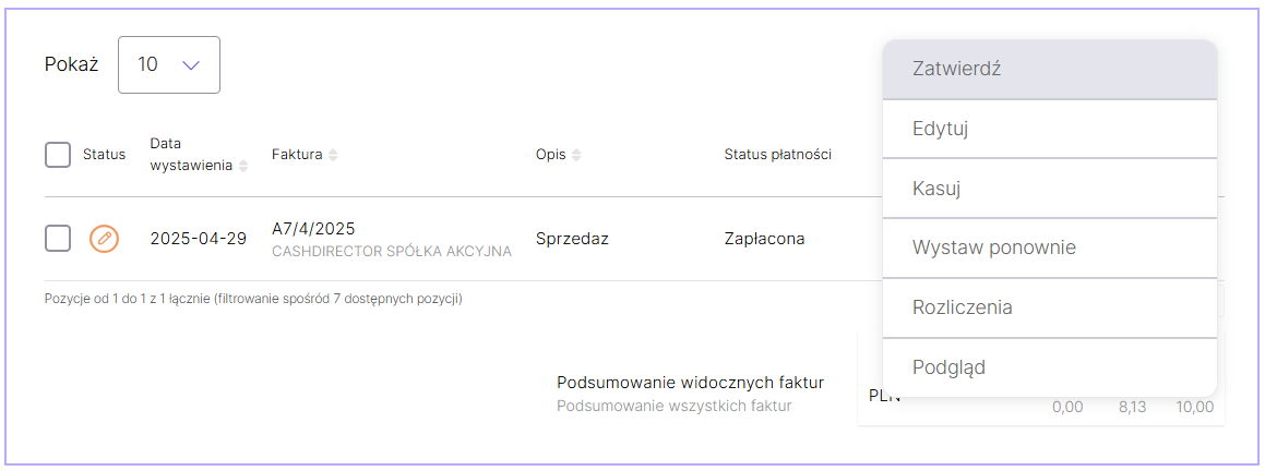 W przypadku zapisania faktury w wersji roboczej zaksięgowanie możliwe jest z widoku listy faktur poprzez skierowania kursora na panel dokumentu i skorzystanie z opcji Zatwierdź: