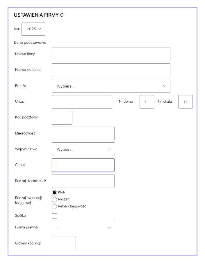 Informacje dotyczące wystawcy faktury pobierane są z zakładki ustawień firmowych. W celu ich aktualizacji należy przejść do zakładki Firma i w sekcji Dane podstawowe dokonać właściwych zmian: