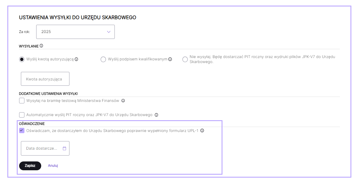 Po zaznaczeniu checkboxem parametru Oświadczam, że dostarczyłem do Urzędu Skarbowego poprawnie wypełniony formularz UPL-1 w poniższym polu konieczne jest wpisanie daty dostarczenia dokumentu.