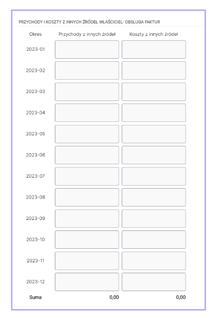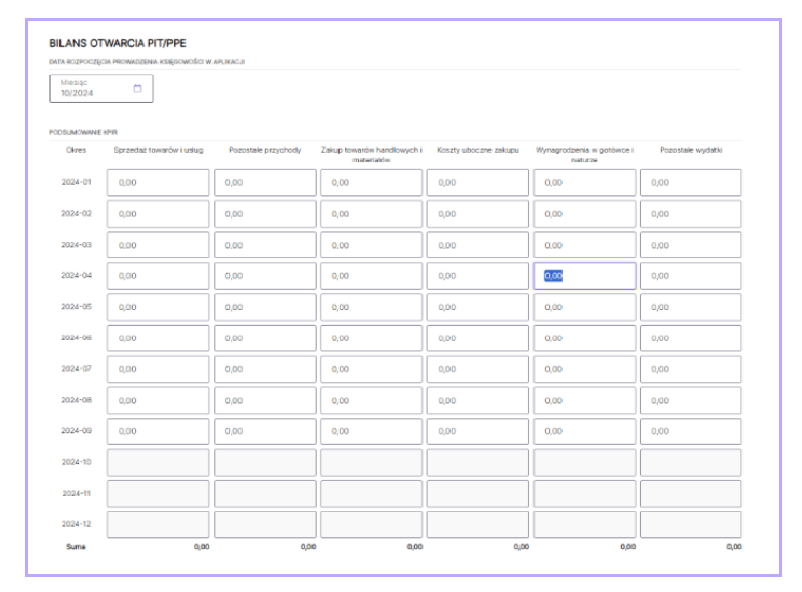 Po przejściu do zakładki widoczna będzie tabela z podziałem na konkretne miesiące do uzupełnienia. O tym, jakie pola będą dostępne do edycji decyduje Data rozpoczęcia prowadzenia księgowości w aplikacji.