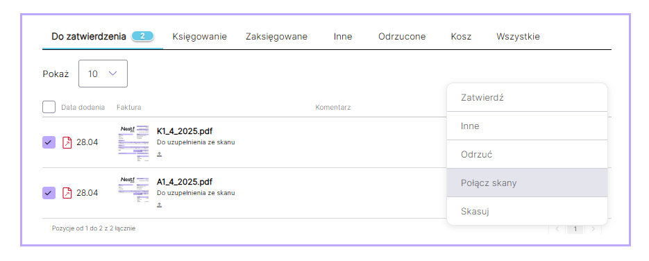 Funkcjonalność łączenia skanów w zakładce Wgrane Faktury służy do połączenia skanów jednego dokumentu o tym samym numerze i od tego samego kontrahenta, jeżeli został wgrany jako kilka oddzielnych plików.