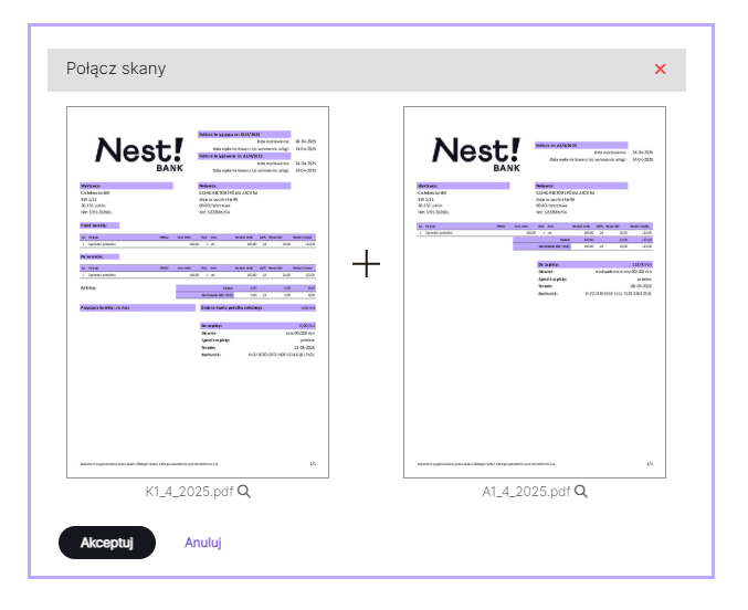 Istnieje możliwość powiększenia skanu i weryfikacji, na której stronie powinien się znajdować. W tym celu należy wybrać szarą lupę przy nazwie skanu widoczną pod skanem. Po wybraniu kolejności łączenia skanów wystarczy kliknąć akcję Połącz. Spowoduje to połączenie skanów lub Anuluj w celu przerwania czynności łączenia.