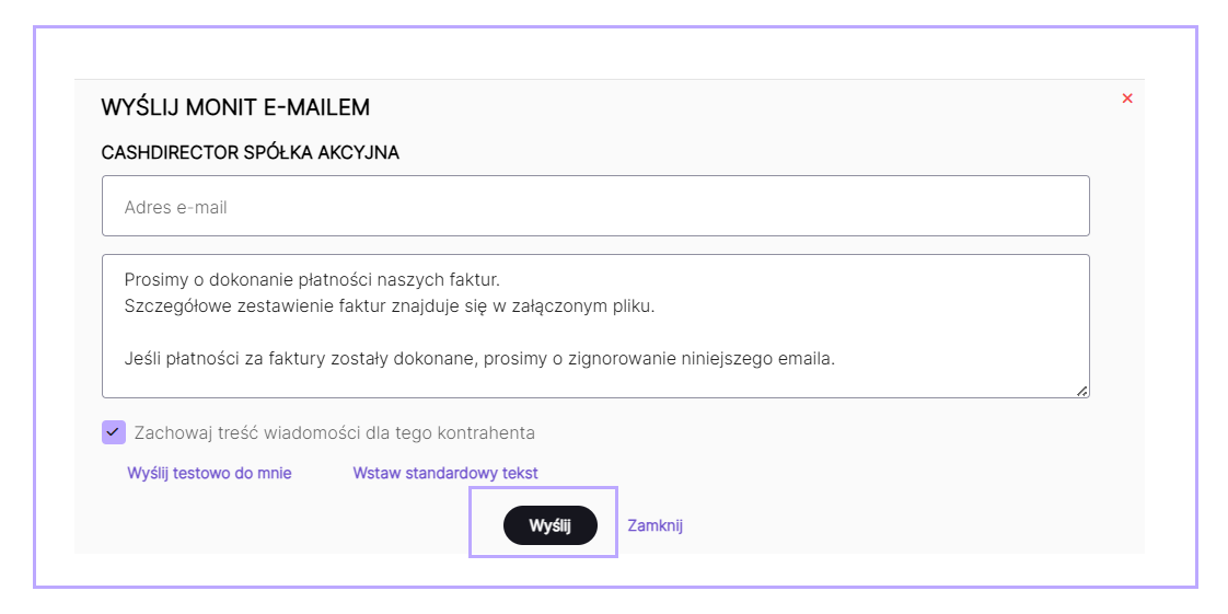 Następnie zostanie wyświetlone okno, w którym należy wprowadzić adres e-mail i treść wiadomości oraz wysłać monit lub wezwanie: