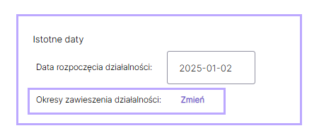 Zawieszenie działalności gospodarczej można wprowadzić w systemie w ustawieniach firmowych. W tym celu przy parametrze Okresy zawieszenia działalności należy wybrać przycisk Zmień i w otworzonym oknie wpisać właściwy zakres dat: