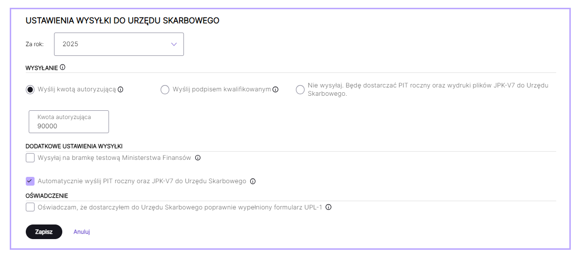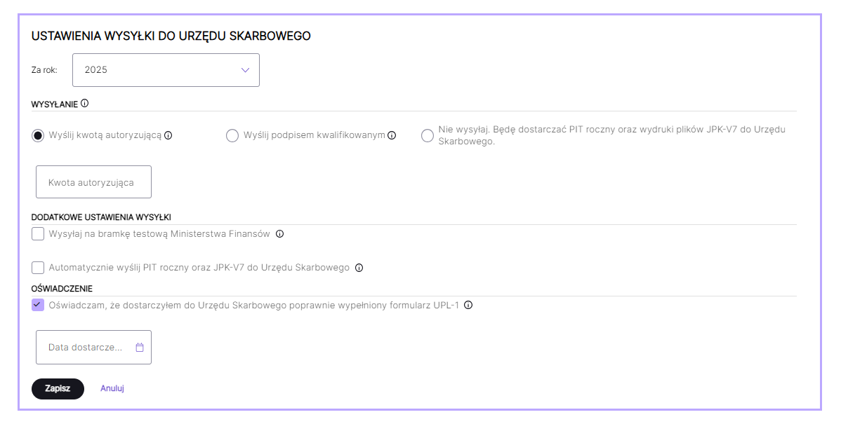 Pole Oświadczam, że dostarczyłem do US poprawnie wypełniony formularz UPL-1 należy zaznaczyć w przypadku, gdy deklarację podpisuje podpisem kwalifikowanym osoba z biura rachunkowego. Niezbędne jest tak wskazanie daty dostarczenie UPL-1, oraz zaznaczenie opcji Wyślij podpisem kwalifikowanym. Funkcjonalność wysyłki deklaracji dostępna jest w zakładce Ustawienia wysyłki do Urzędu Skarbowego.