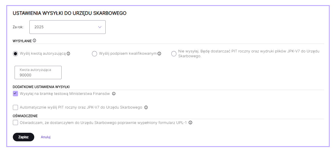 Zakładka Ustawienia wysyłki plików JPK-V7 służy do sparametryzowania ustawień wysyłki pliku JPK_V7 oraz deklaracji VAT UE do Urzędu Skarbowego. Użytkownicy systemu mają możliwość skorzystania z wysyłki za pomocą podpisu elektronicznego lub kwoty do autoryzacji.