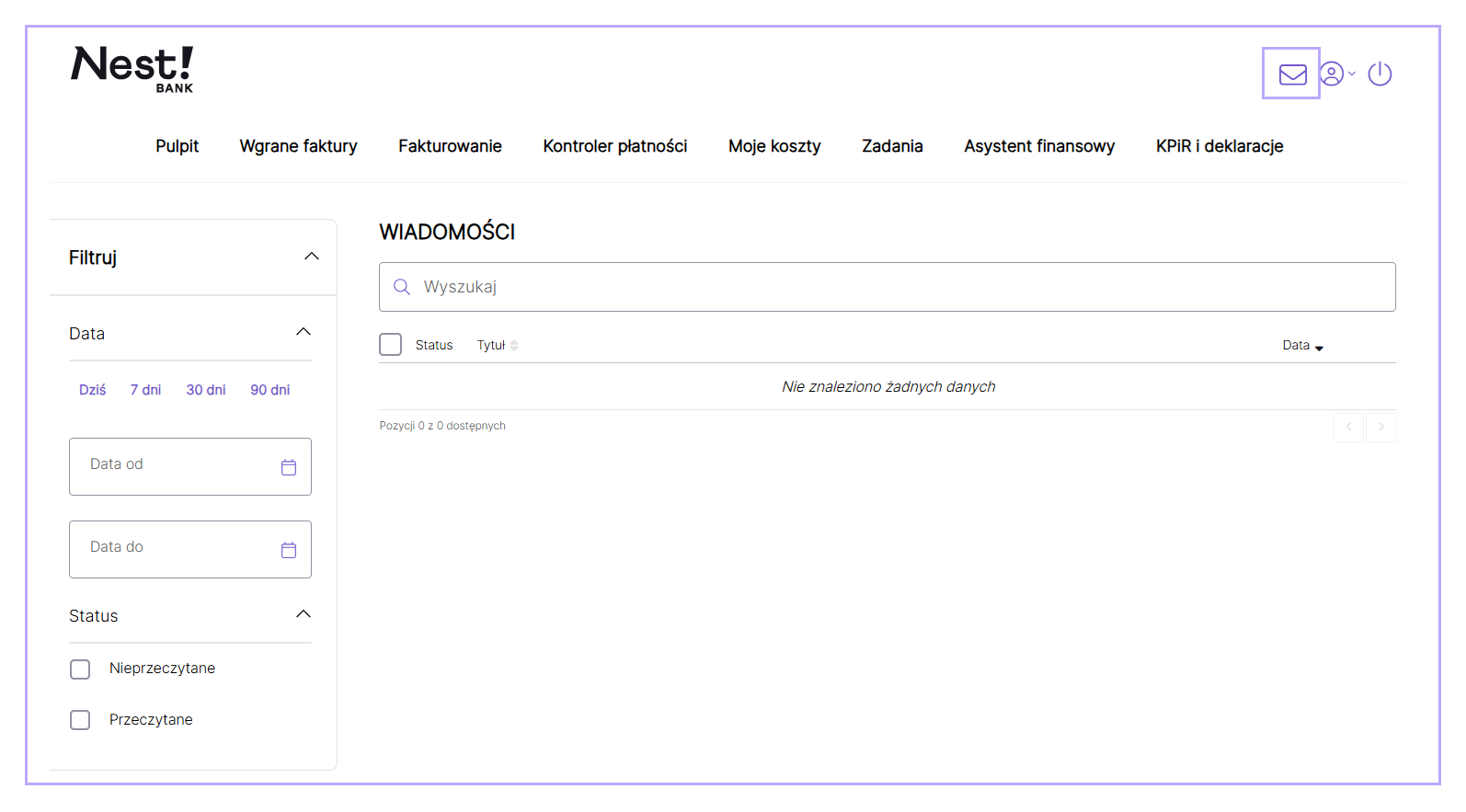 Wiadomości, które generowane są automatycznie przez program, w systemie Obsługa Faktur znajdują się w prawym górnym rogu po kliknięciu w ikonę koperty.