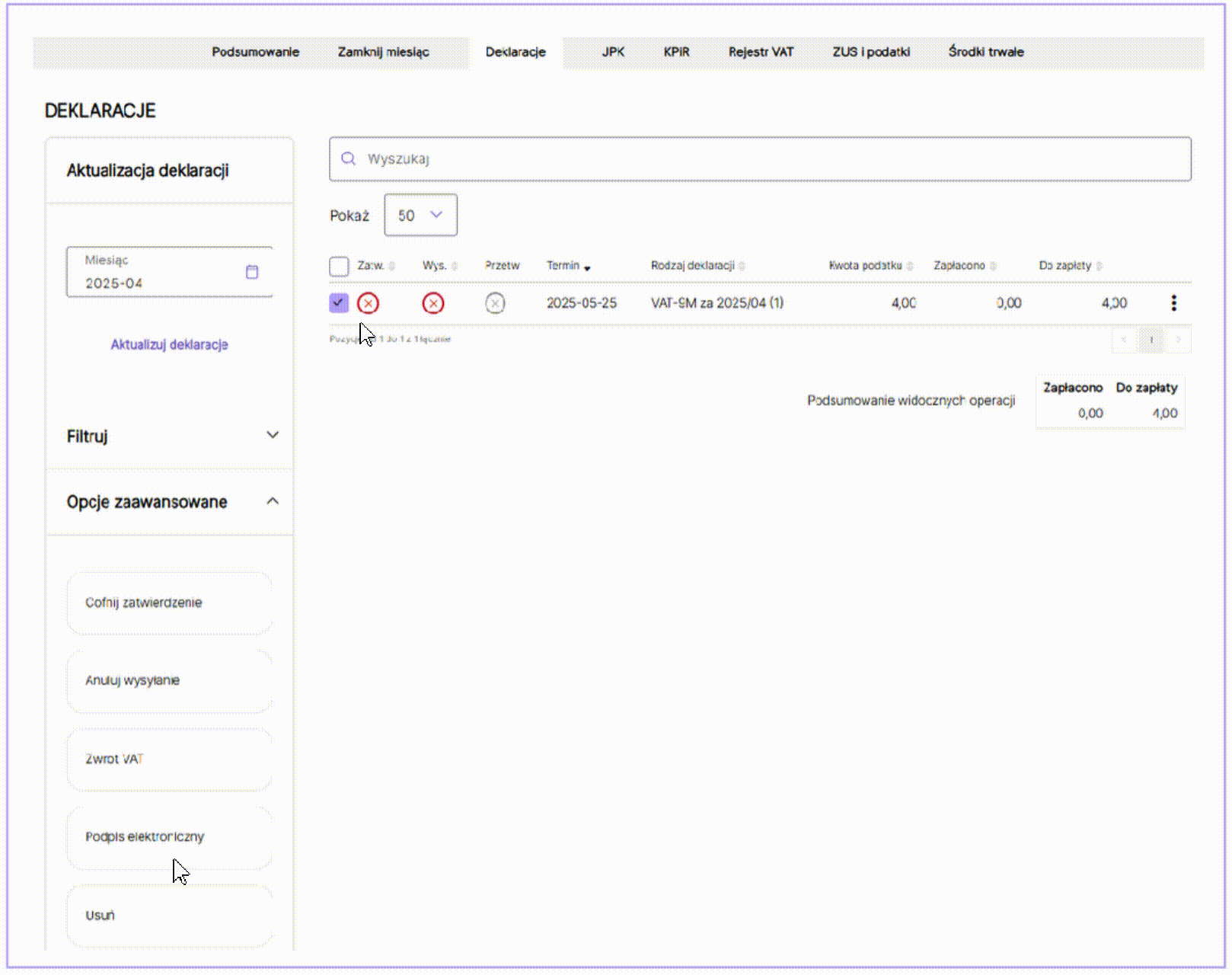 Deklaracja będzie widoczna w zakładce KPiR i deklaracje /Deklaracje.